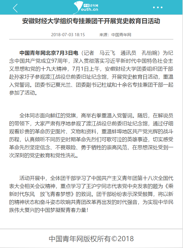 7月1日,中国青年网报道我校组织专挂兼团干开展党史教育日活动