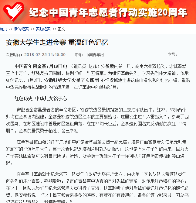7月19日,中国青年网报道我校学子暑期“走进金寨 重温红色记忆”。